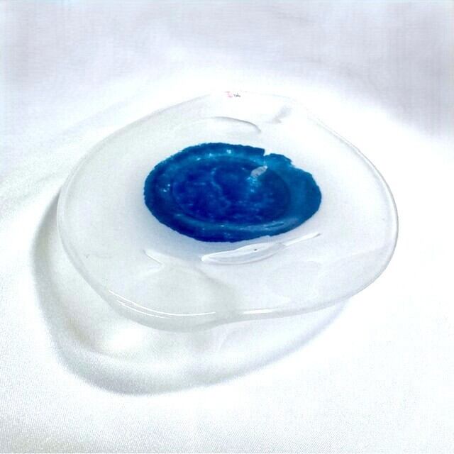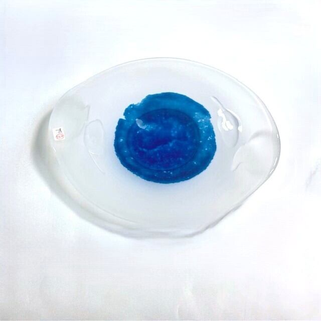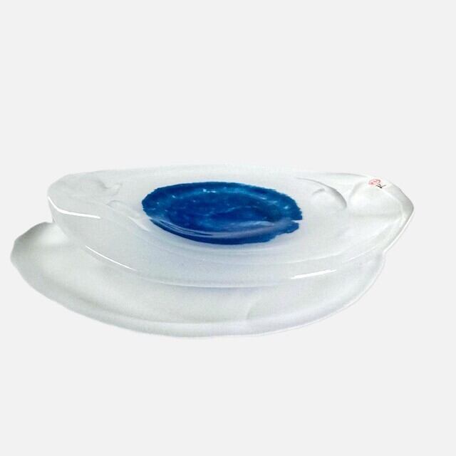 【 ガラス作家 吉野マサキ 】 入白色の真ん中に青の色合いが目を引く流線皿。 器の表面や縁に流れるような曲線が特徴の流線皿は、作家の手により丁寧に仕上げられた特別な一品です。 上品な色合いで製作されているデザインは、テーブルに華やかさを加えます。 美しさと機能性を兼ね備えた、特別な一品をぜひお楽しみください! ■サイズ :約17.5×13.8xH約2.5cm ■重さ :260g 手作りのため、形や模様、色合いには個体差がありますので、あらかじめご了承くださいませ。